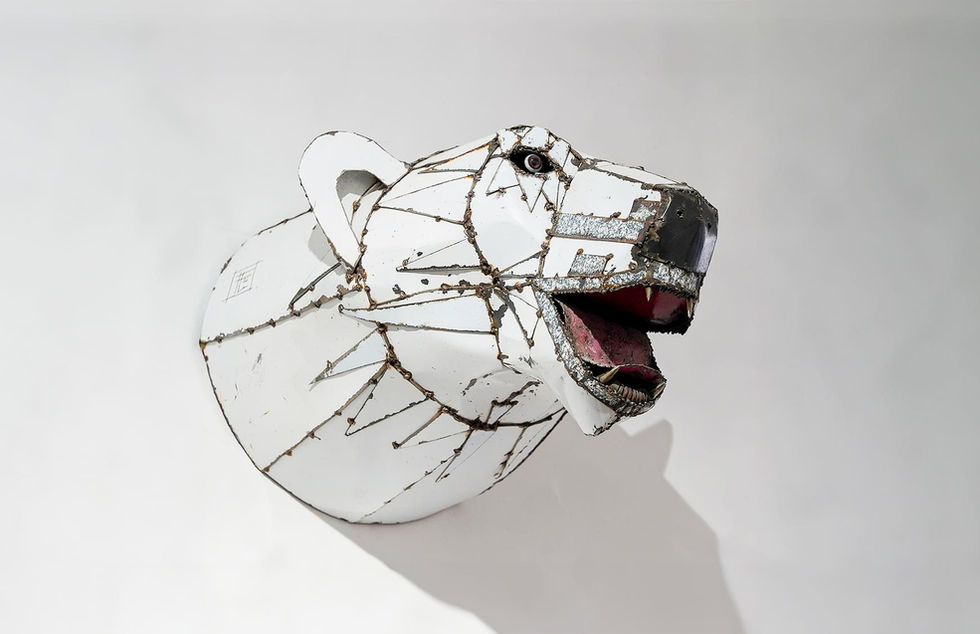 Techniques utilisées : Métal recyclé, acier, ferraille, bois, os, cornes